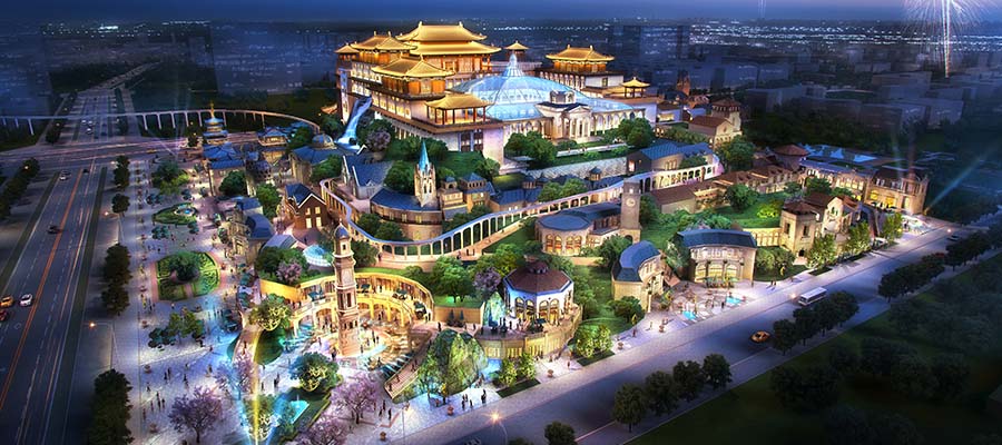项目包括景区、商业区、博物馆、主题酒店等主要功能区,绿化特色为近岸桃李梨杏,杂花相间。
